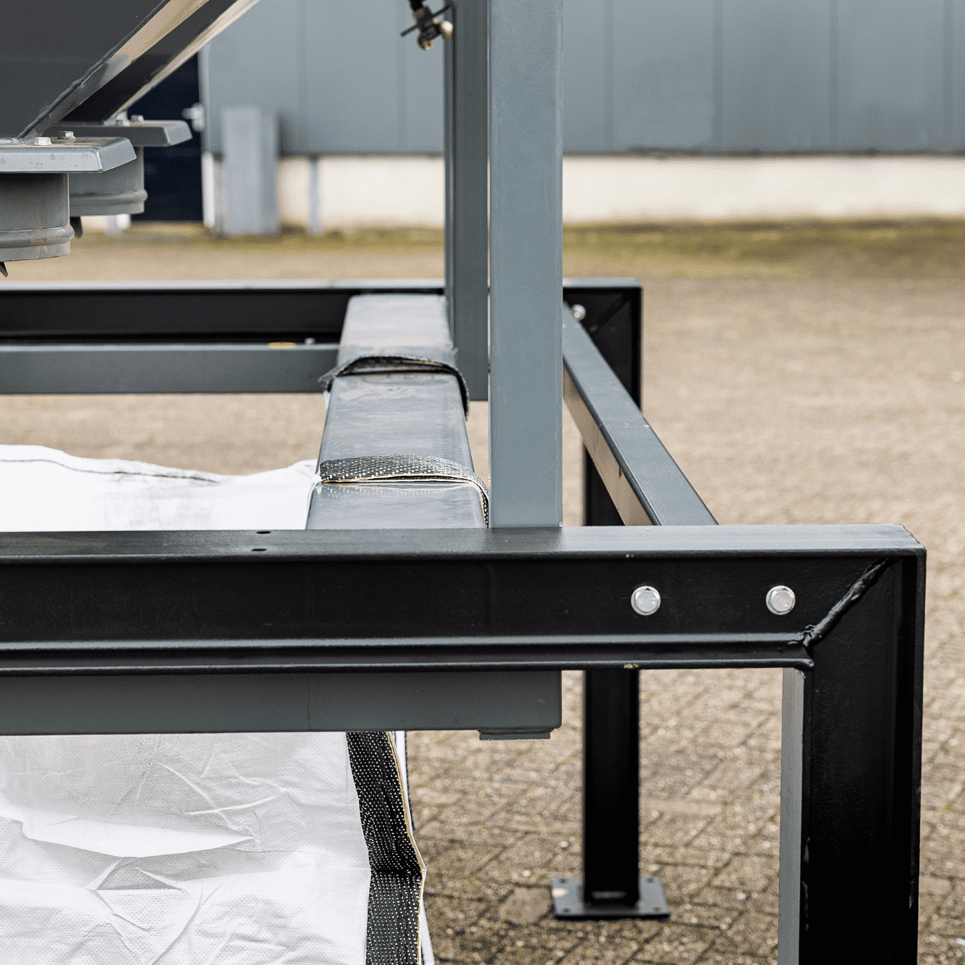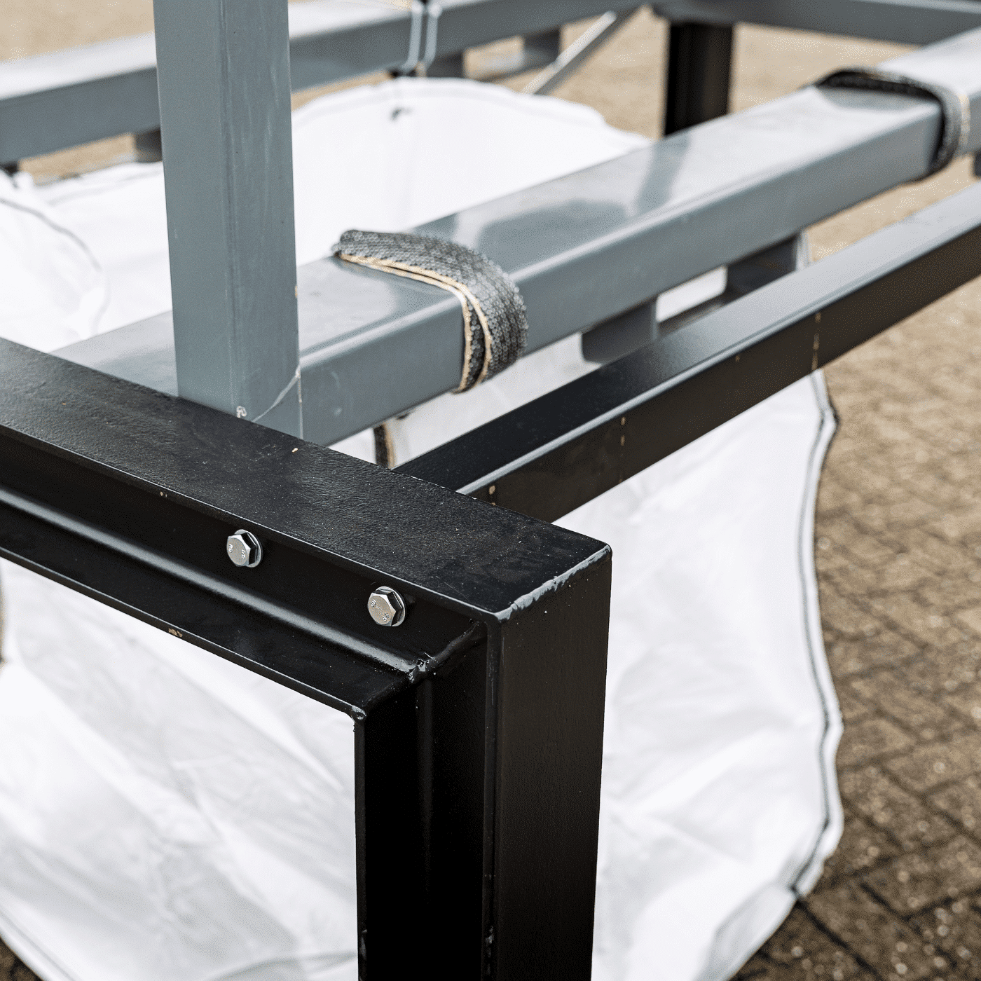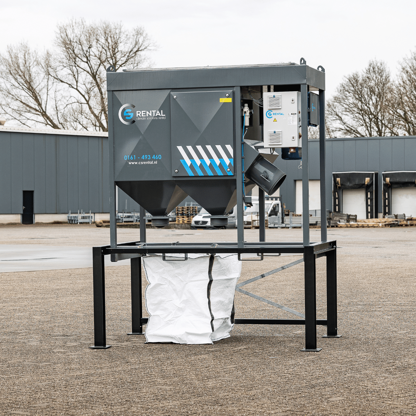 Op de afbeelding is een opstelling gemaakt met het frame en de CDC-6. De CDC-6 kan in het frame worden geplaatst, vervolgens is het mogelijk om big-bags onder de stoffilterbox te plaatsen. De big-bags vangen het stof op dat uit de lucht wordt gefilterd. Door het frame en de big-bags kan een stoffilterkast voor langere tijd achtereen in gebruik worden genomen simpelweg omdat er meer stof opgevangen kan worden. Een oplossing op maat nodig? Alles kan worden aangepast aan uw wensen.
